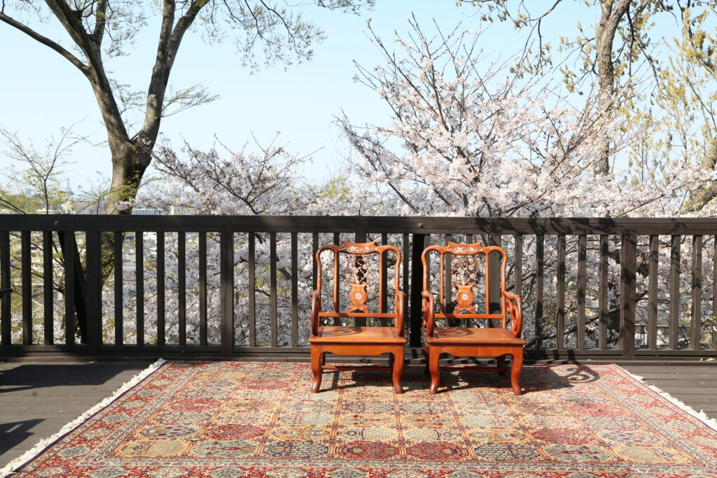 桜の木が迎えてくれる、広々とした2Fのテラス。ふだんは喫煙所としてご利用いただいておりますが、ウエディングの際はウェルカムドリンクや、カクテルパーティのスペースなどとしても。