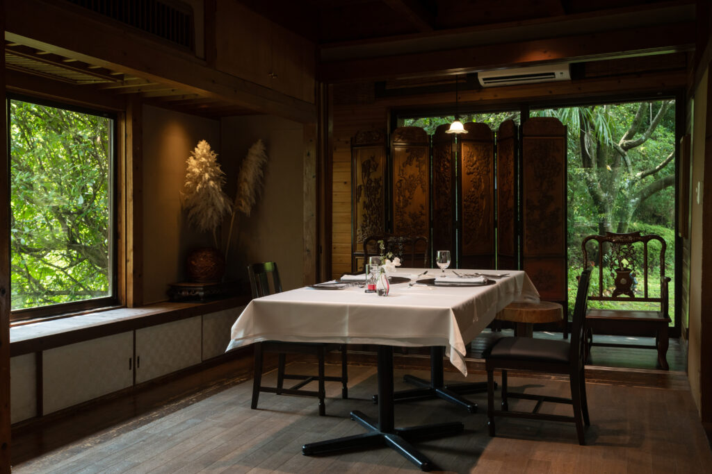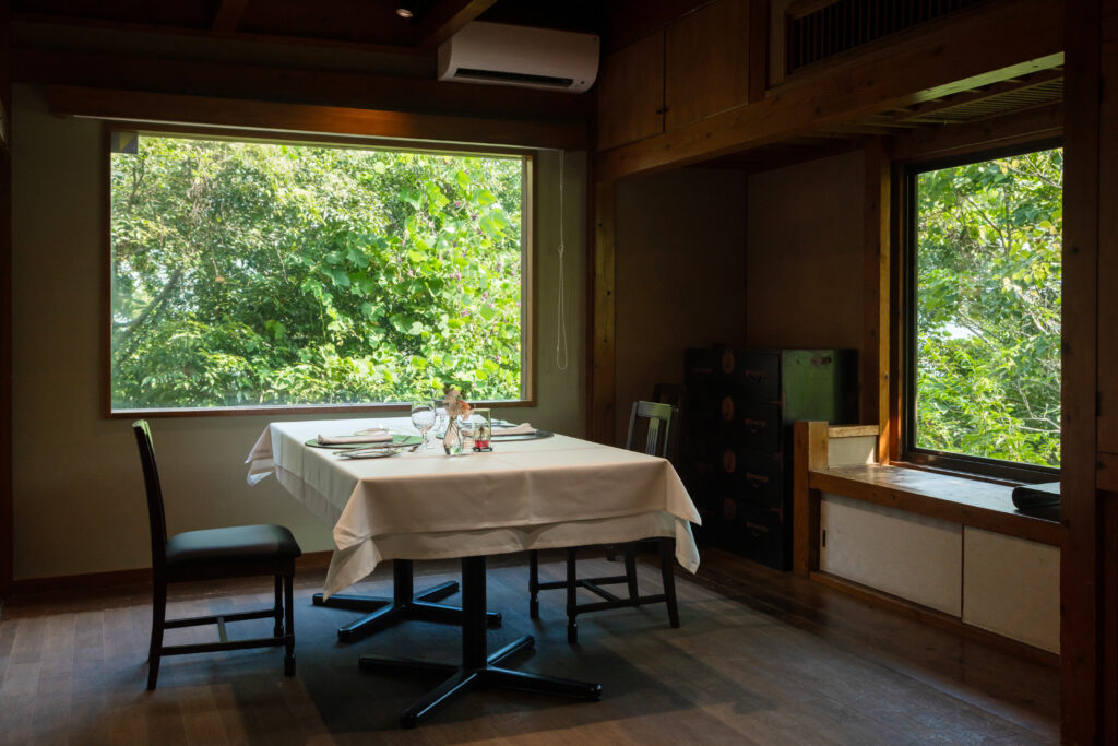 人気のフォトスポットでもある、ラインの美しいアンティークシャンデリアのある吹き抜けです。プライベートガーデンをのぞむ出窓の席もあり、こちらでもお庭を楽しみながらおくつろぎいただけます。