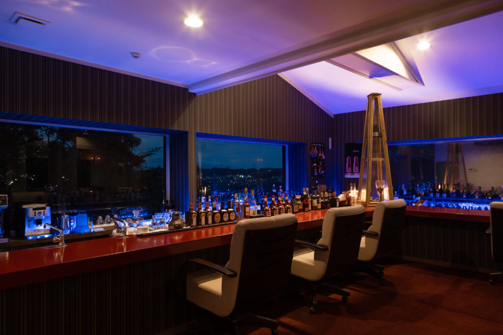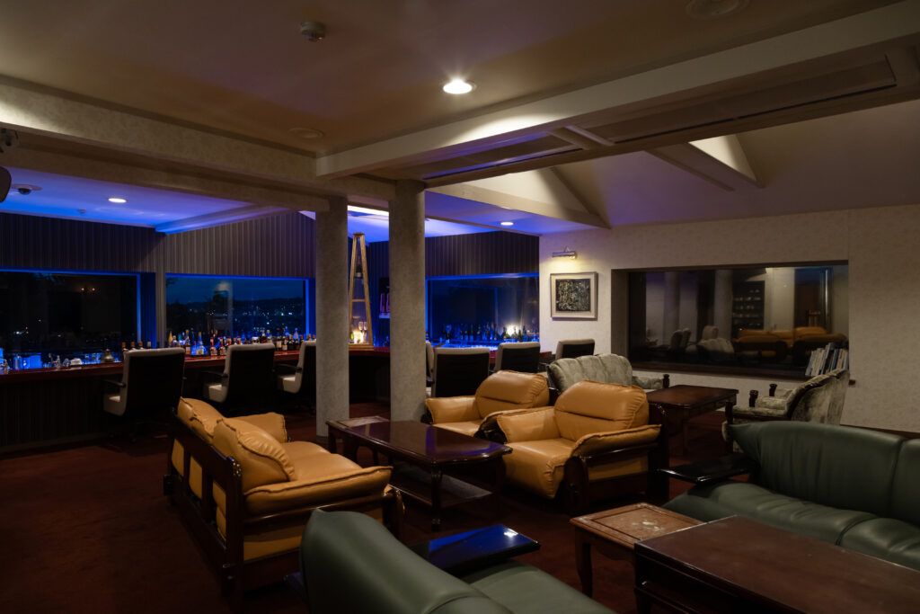ソファでゆったりとお寛ぎいただけます。夜は、バーに青い光が灯り、とてもフォトジェニックです。トイレは2Fにもございます。